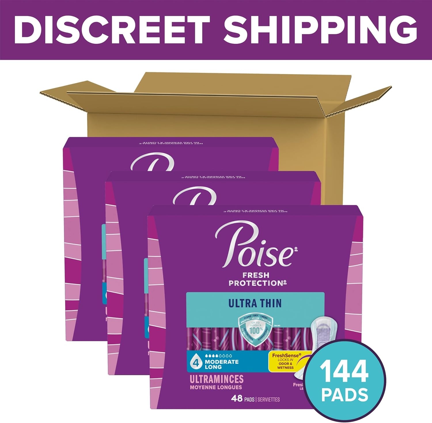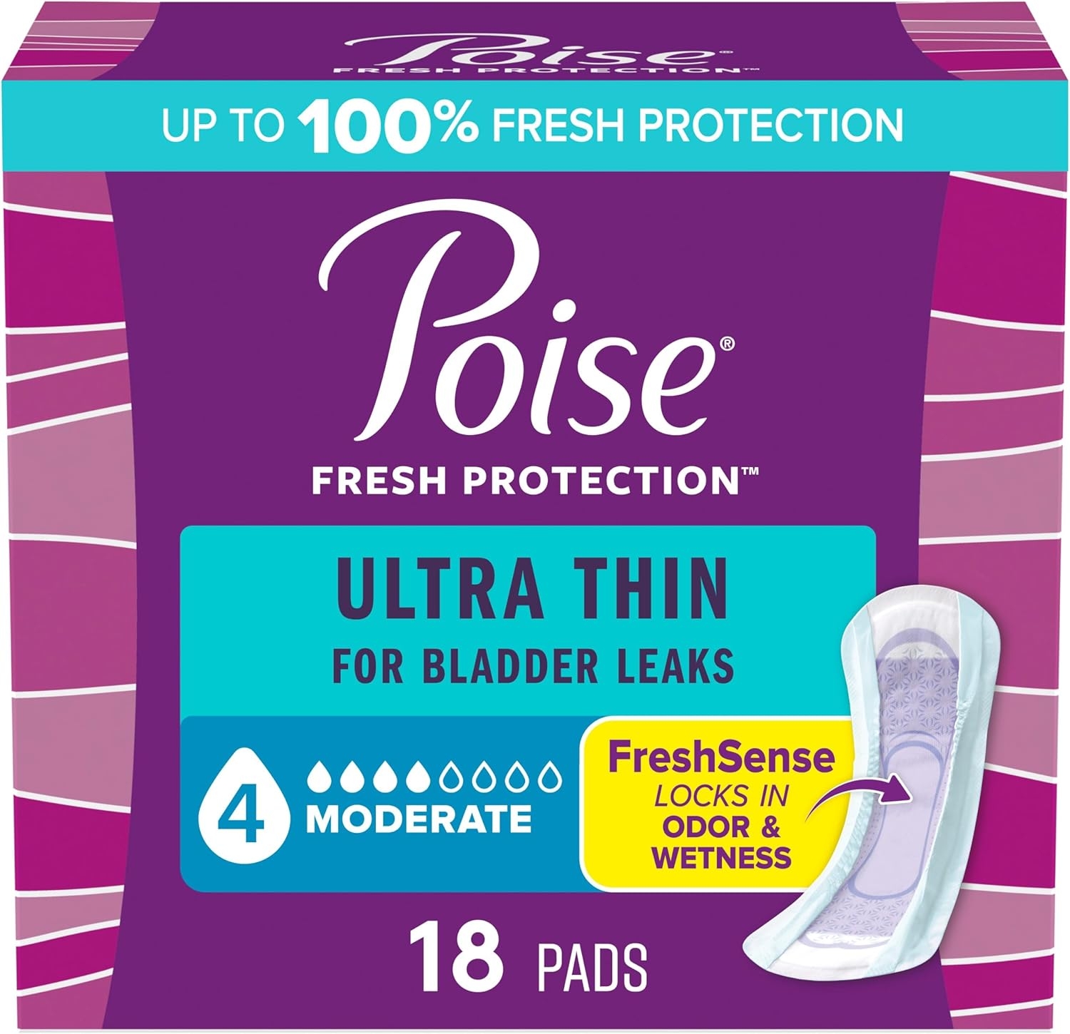 Enjoy up to 100% clean, dry and fresh protection with our thinnest incontinence pad, Poise Ultra Thin Incontinence Pads. Unlike period pads, which are meant for menstrual needs, Poise pads are designed to offer protection specifically against light bladder leaks. In fact, Poise bladder control pads have a Dry-Touch layer that rapidly locks away more* wetness for a clean feel and offer up to zero leaks. Plus, our disposable incontinence pads feature Leak-Block sides for dryness and outstanding protection. As our thinnest protection, each incontinence pad has a Thin-Flex design that holds its shape for all-day comfort. These women’s pads are made with breathable materials that let fresh air in to help eliminate dampness and keep you feeling clean and fresh. Poise incontinence pads are available in Light, Moderate, Maximum and Overnight absorbencies. For lighter absorbency needs, check out Poise Daily Liners. Shop for Poise discreetly by having it shipped directly to your door or pick up curbside. Poise adult incontinence products are HSA/FSA-eligible in the US – check with your provider for coverage details. (*vs. leading period pads, 24 ml of fluid)